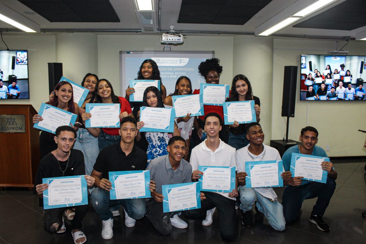 A certificação de aprendizes realizada no dia 2 de abril reuniu as turmas 032/2024, 001/2025, 017+018/2025 e BMB para a conclusão do ciclo formativo na Assprom.