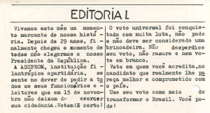 O incentivo ao voto expressou o compromisso da Assprom com a formação cidadã e o protagonismo juvenil na primeira eleição presidencial direta após o fim da ditadura.